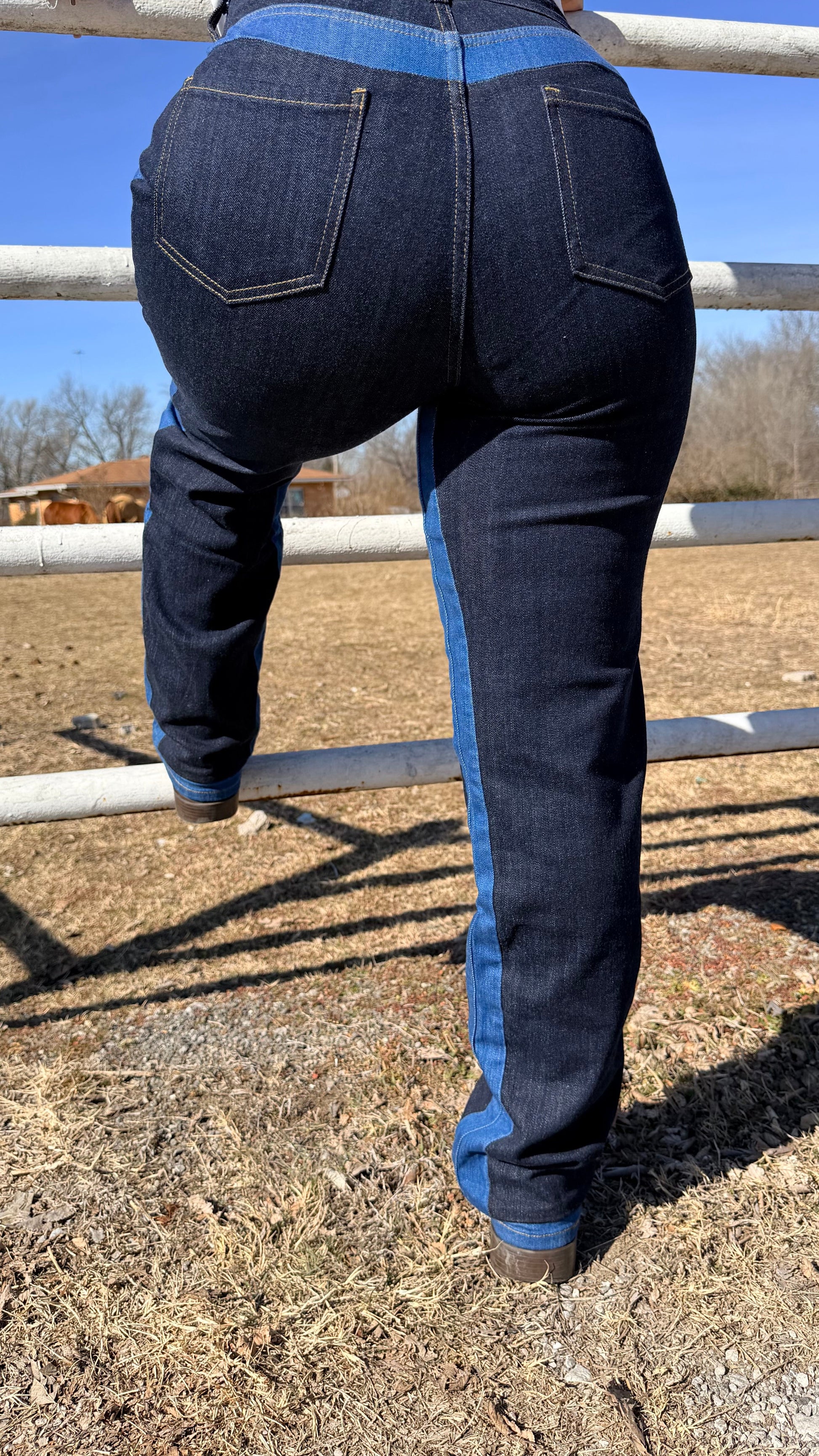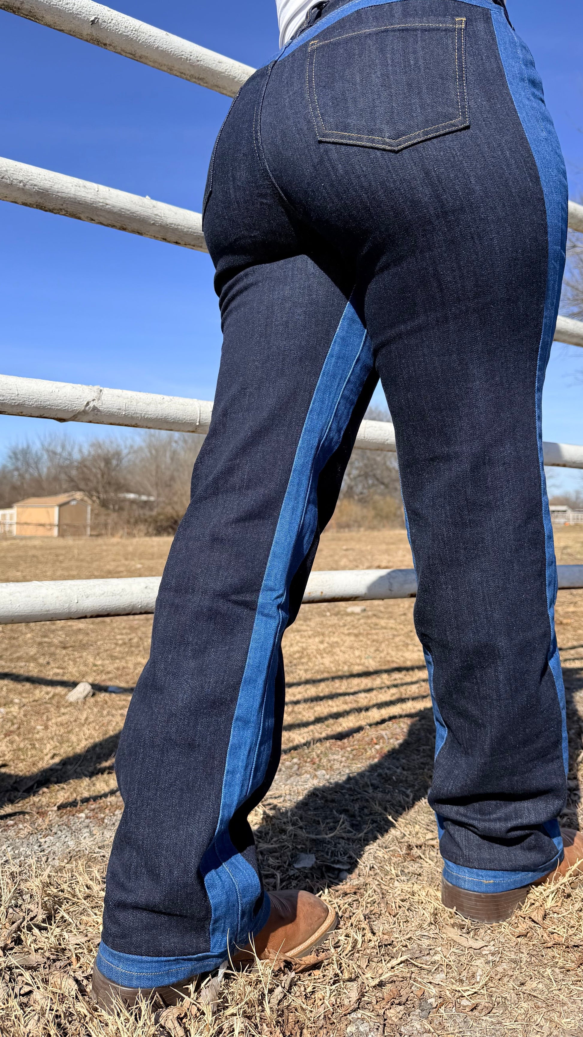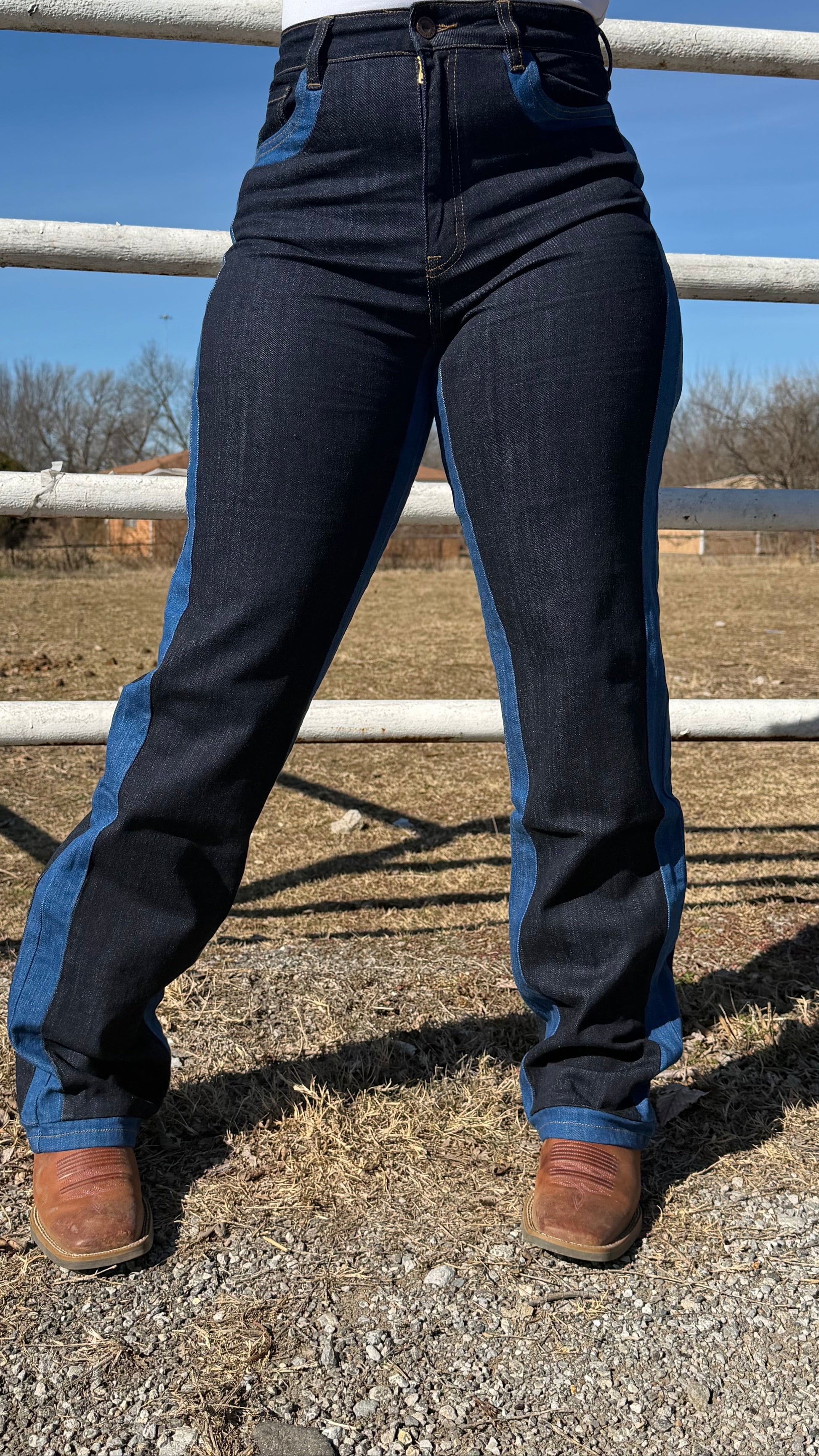 A timeless silhouette with a modern western edge. These high-rise straight-leg jeans are crafted from deep indigo denim with subtle contrast panel detailing along the sides for a bold yet classic look. Designed to hug the waist and fall straight through the leg, they offer a flattering fit that’s comfortable, structured, and made to last.